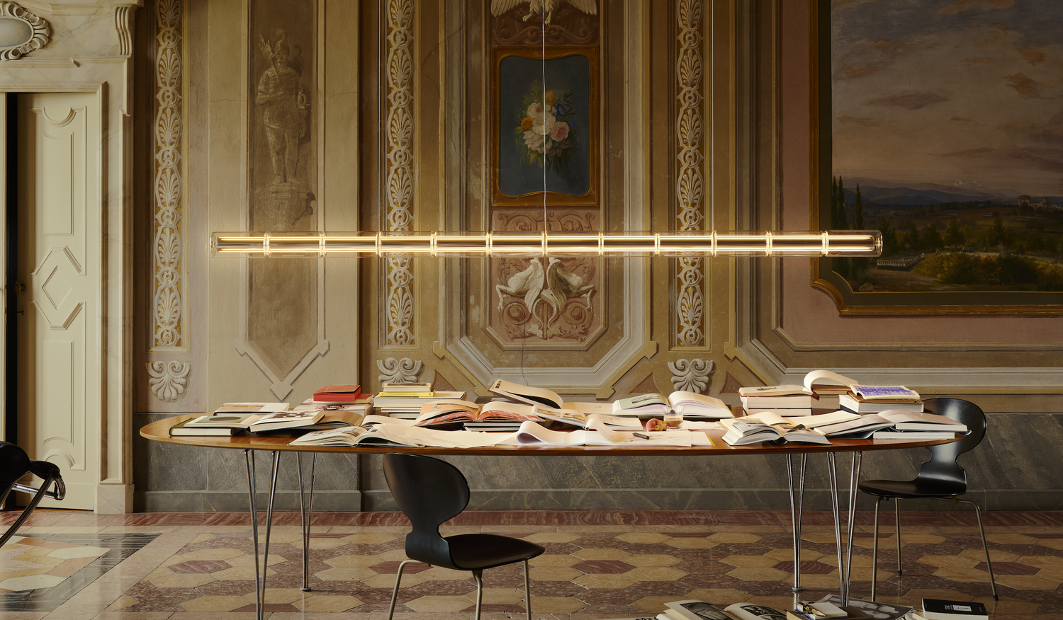 義大利燈具名品 Flos Noctambule 燈具系列,出自 Konstantin Grcic 2019 年為 Flos 打造的作品,是一系列運用晶瑩剔透的口吹玻璃之美,透過先進的 LED 燈源技術配置,以圓柱與圓柱之間的連結圓環,巧妙地隱藏入光源。