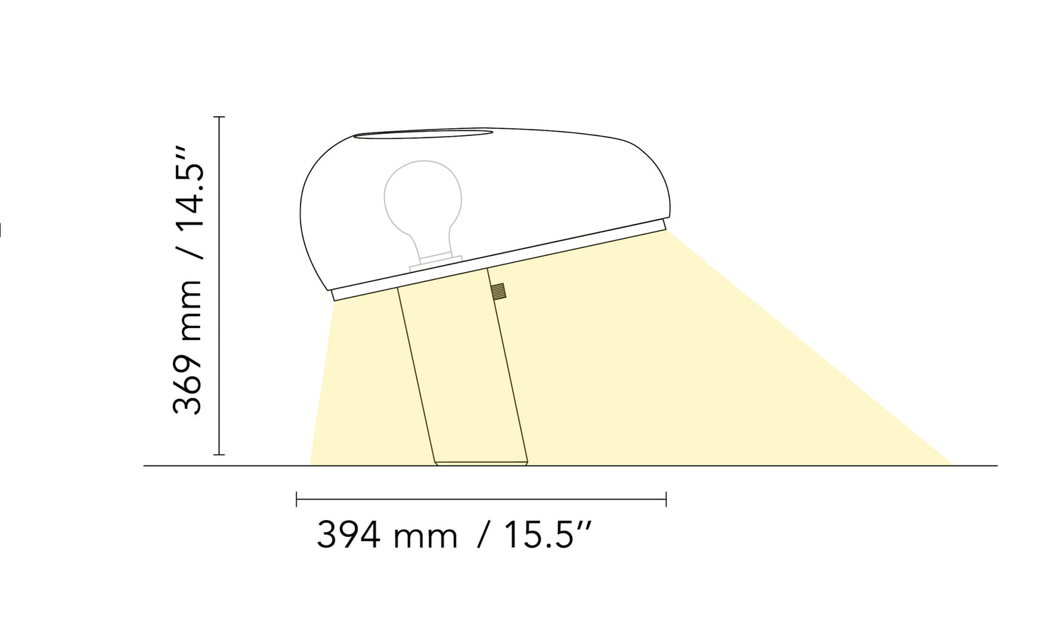 Snoopy 桌燈的反射燈罩與其下方的玻璃,和角度微斜的大理石圓柱體垂直,這樣的設計將光線幾乎完全集中在反射罩所對應的工作區域,而對另一側的光線則加以限制,避免光線分散。