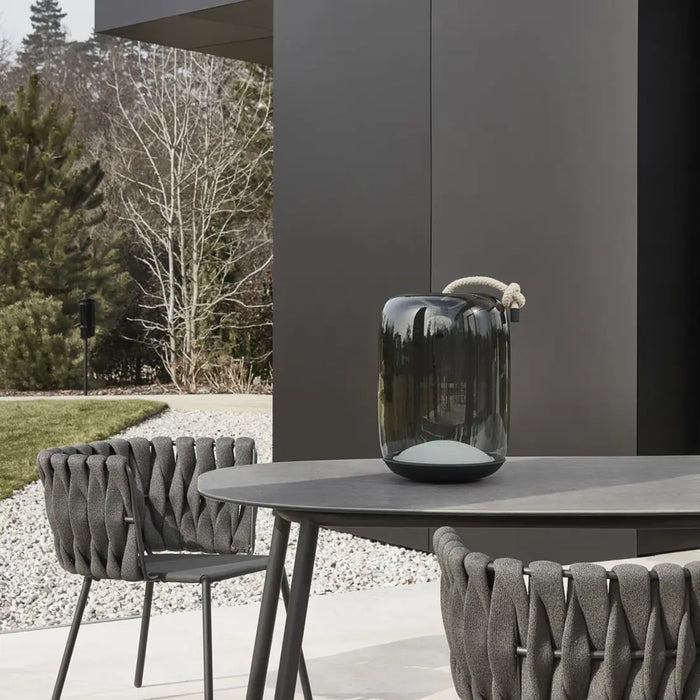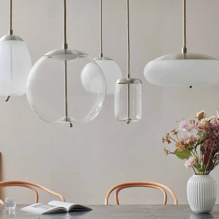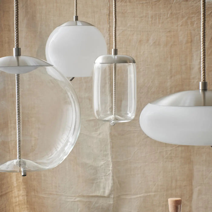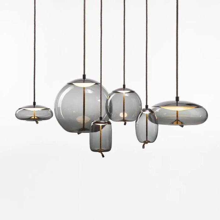 進口吊燈 Knot 燈飾系列,精妙運用手工口吹玻璃、金屬和繩編織,充分發揮三種材質的獨特特色,並以繩索垂掛的姿態營造出彷彿捕獵討海的原生感。透過清透高質感的口吹玻璃工藝,呈現半透明乳白色、煙燻色、煙燻褐色等多種色調,由暈黃、內斂黑,到溫潤白色等氛圍,這一系列在金屬燈片的映射下,完美展現了現代風格與深邃工藝底蘊的流暢呈現。
