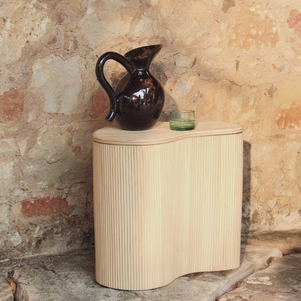 Ferm Living 的 Isola 邊桌搭配可掀式桌蓋,巧妙結合收納機能與日常用途,既可作為客廳或臥室的邊桌,也適合作為兒童房的玩具收納箱。