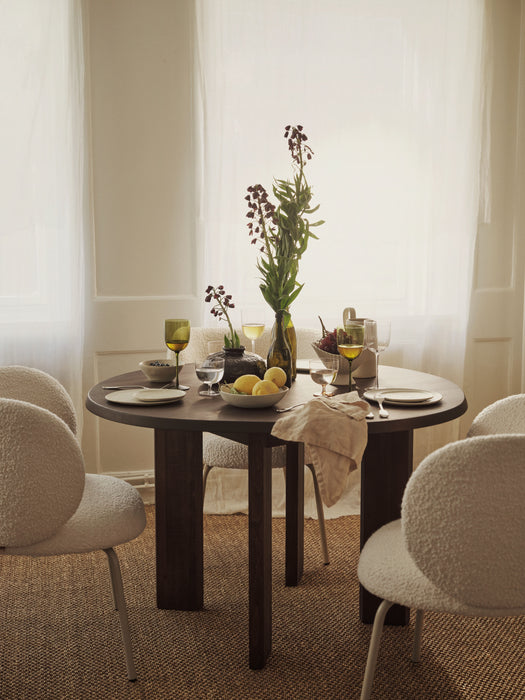 Tarn 圓形餐桌是專為現代小宅或精巧餐廳設計的實木家具。它延續了 Tarn 系列的溫潤質感與簡約風格,以其小巧的 115cm 類圓形桌面,為 2-4 人家庭創造一個親密、高效且充滿北歐自然氣息的用餐角落。