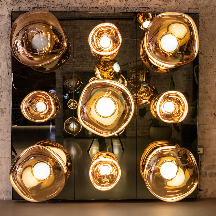 Melt 壁燈以聚碳酸酯作為燈身主體,內層以科技真空電鍍技術,將金屬分子以極細薄的工法製程電鍍覆上,呈現紅銅耀眼、銀色璀璨、金色光華、優雅煙燻的四種精彩意象,猶如藝術品般的光影傑作,呈現出獨特的照明魅力, Melt 熔岩壁燈能為空間帶來獨特別緻的氛圍。